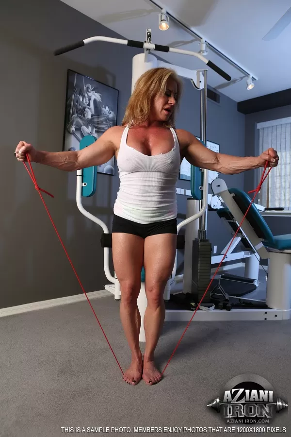 - 5. Пожилая широкоплечая Сэнди снимает тренировочную одежду для сеанса мастурбации.