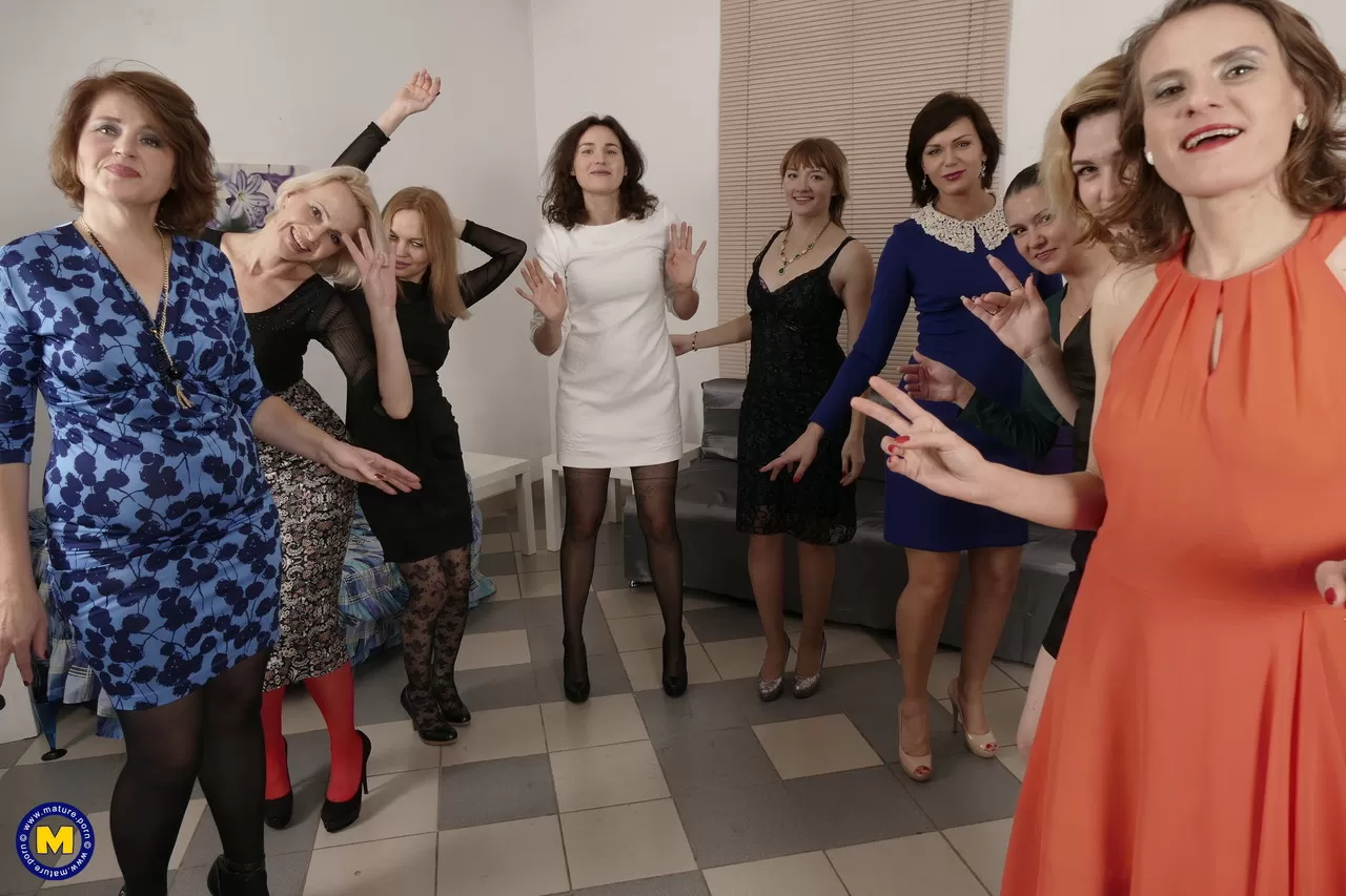 - 2. Группа зрелых женщин раздевается до чулок и каблуков перед обратной групповухой.