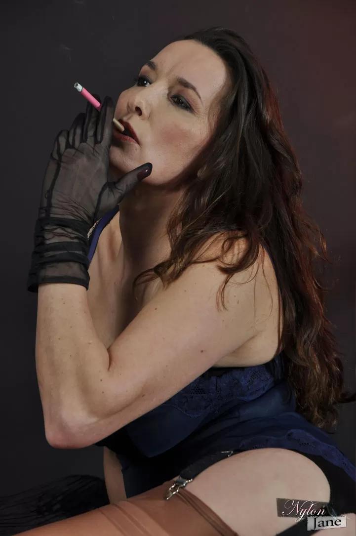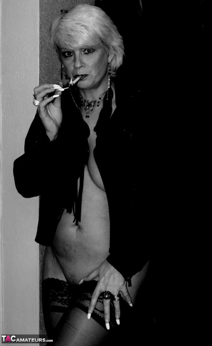 - 1. Милфа с большой грудью позирует в одних нейлоновых колготках и курит сигарету.