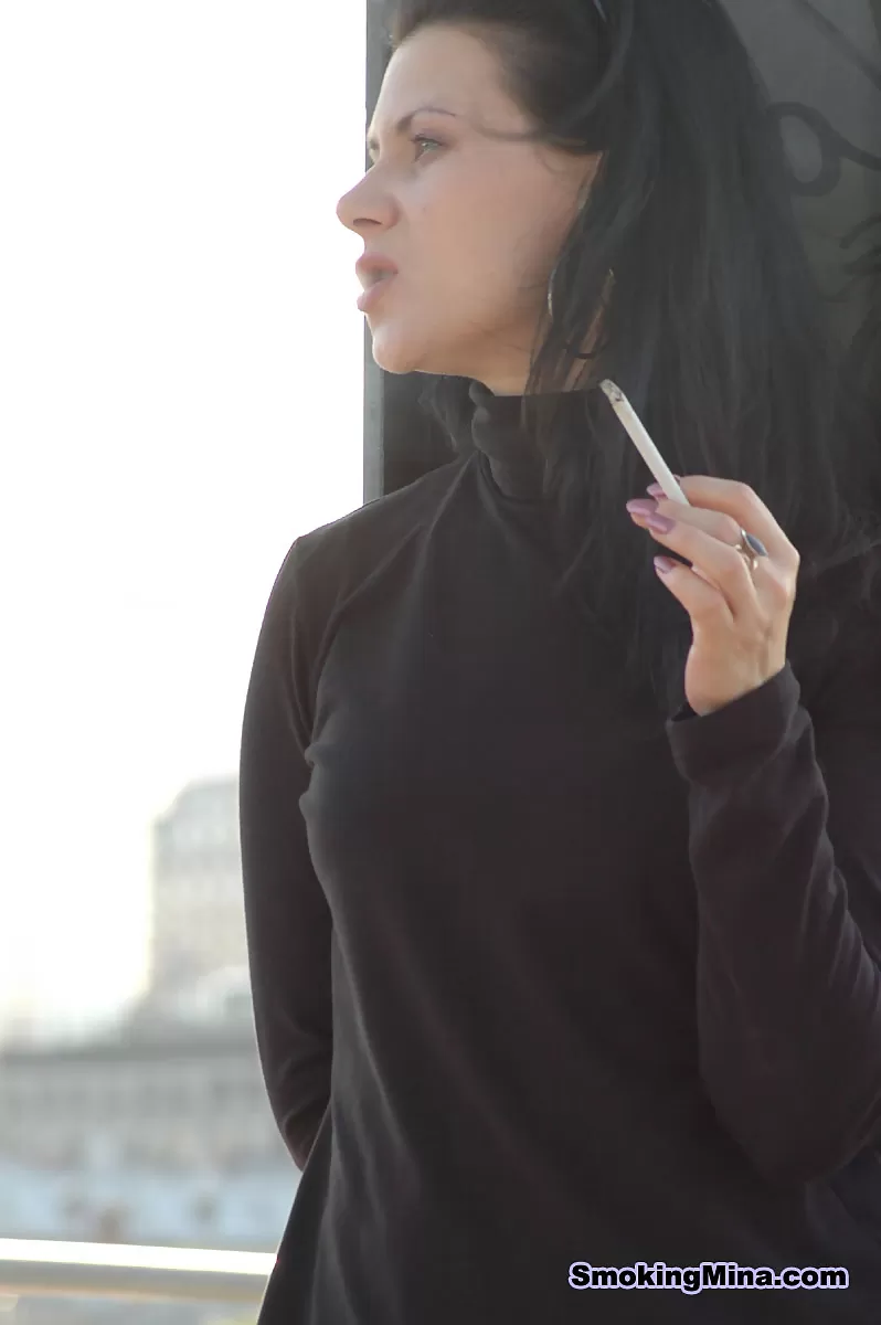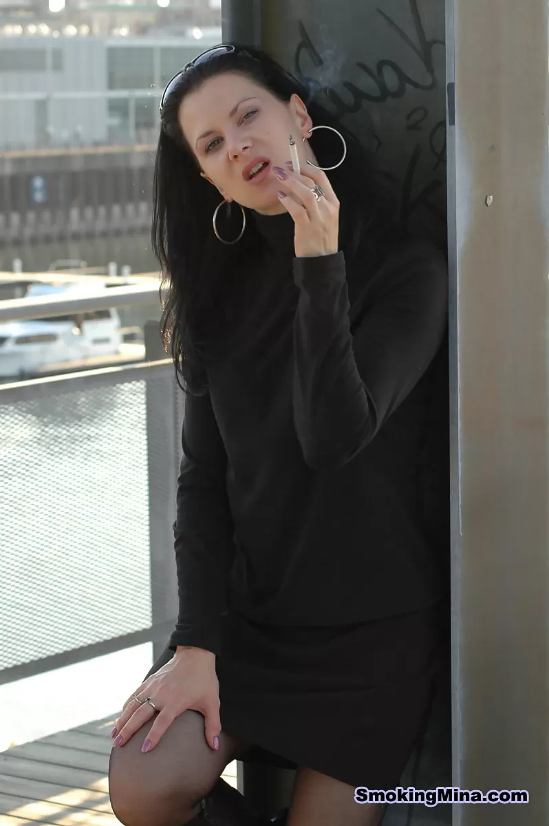- 2. Рыжеволосая женщина Мина курит сигарету в коричневых чулках и на каблуках.